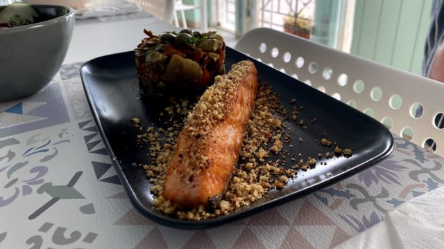 Lombo de salmão grelhado, brôa esmigalhada, mini brás de batata doce e legumes