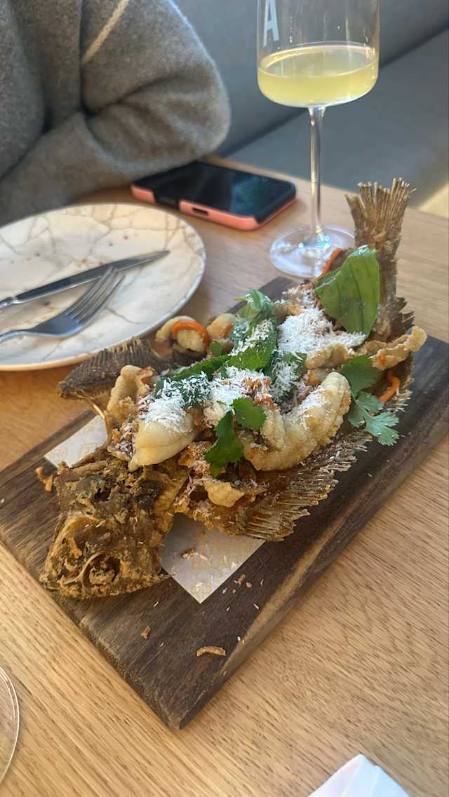 - Servido frito entero, se comen hasta las espinas. Con salsas asiáticas, albahaca, menta, cilantro y coco.