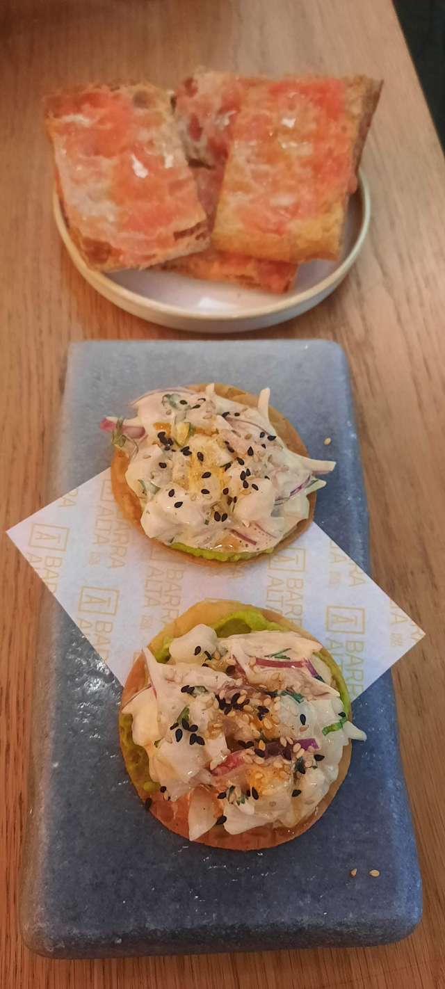 - Cremoso tartar de vieira y bogavante, sobre tostada de maíz crujiente, cebolla y aguacate (2 ud).