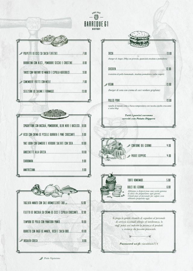 Accoglienza, ricercatezza nei dettagli di designe del locale e la qualità delle materie prime delle nostre proposte culinarie, rendono il Barrique 61 un locale che trasmette genuinità e tranquillità per passare una serata all insegna della spensieratezza.