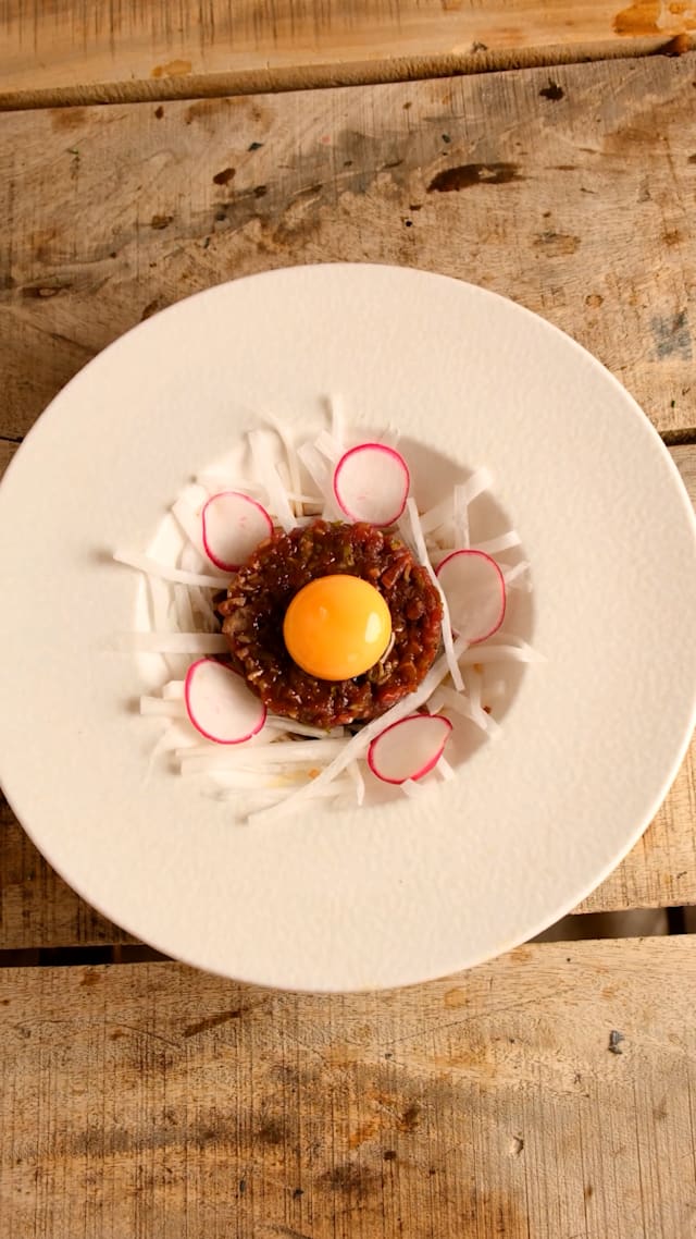 Carne picada finamente a cuchillo con la receta tradicional, servida sobre daikon.