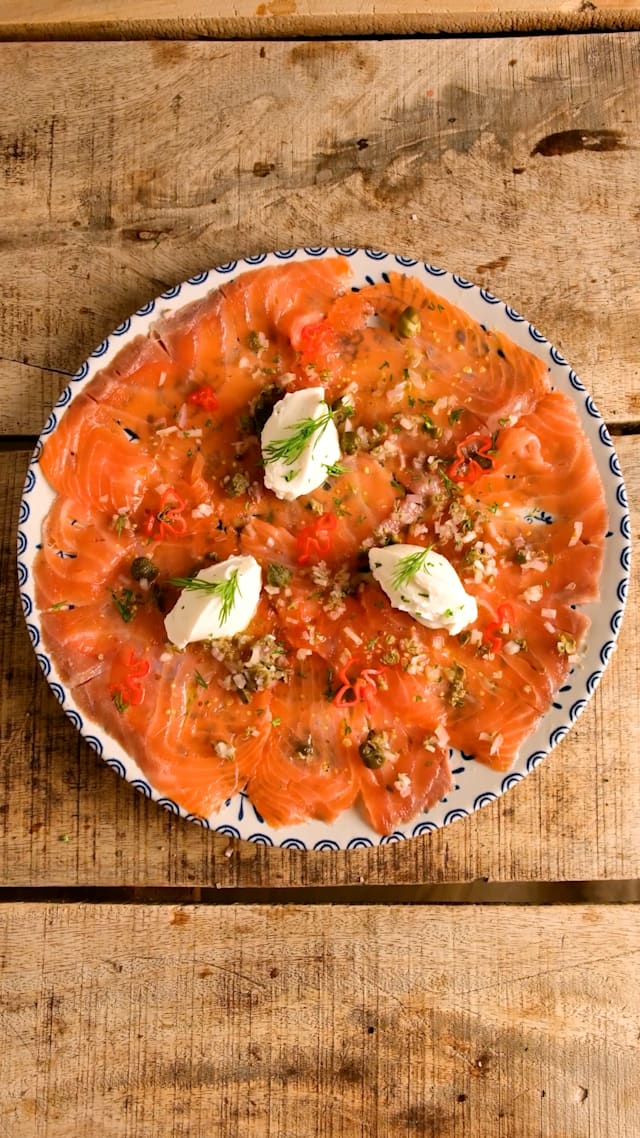 Láminas de salmón ahumado marinadas en nuestro aderezo de mostaza, con un ligero toque de habanero y alcaparras acompañado de queso crema