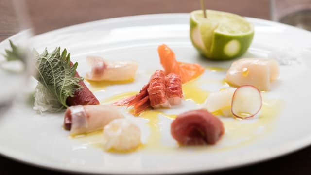 Sashimi misto impreziosito con olio extravergine di oliva grand cru musignano, varietá caninese I&P