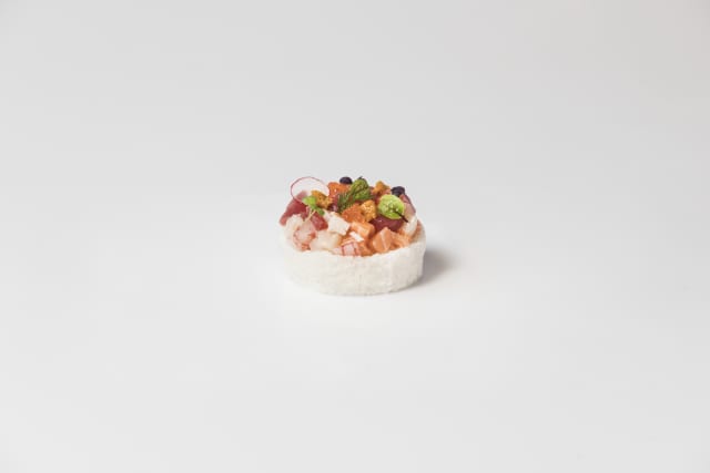 Letto di riso con cubetti di pesce misto e salsa dello chef