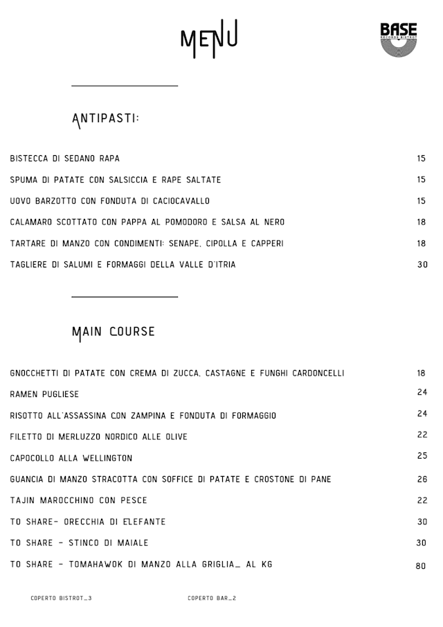 10/10We were warmly welcomed on arrival at Base Records Bistrot. It is a lovely venue with a downstairs bar area and an upstairs restaurant. We ordered the baked cod and fish tagine - both were perfectly cooked and delicious and we also enjoyed some local Puglian wine. The owner came and chatted with us which was also a nice touch. Great food, service and venue. Will definitely return when next in Bari.