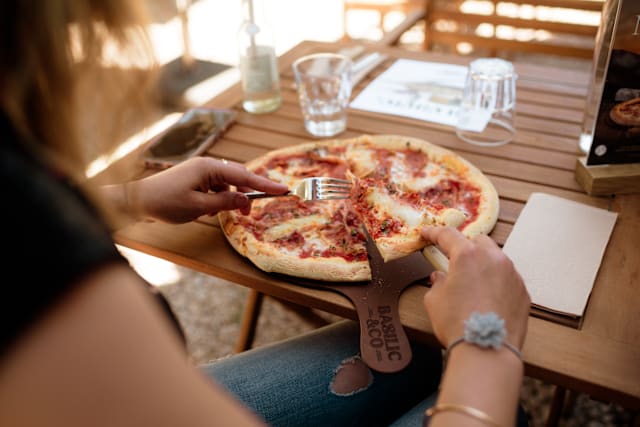 Une pizzette - sauce tomate, jambon et mozzarella ou sauce tomate et mozzarella