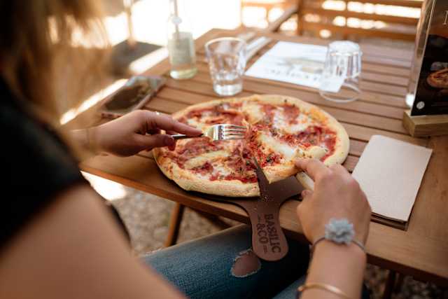 Sauce tomate, jambon et mozzarella ou sauce tomate et mozzarella + une boisson fraîche au choix.