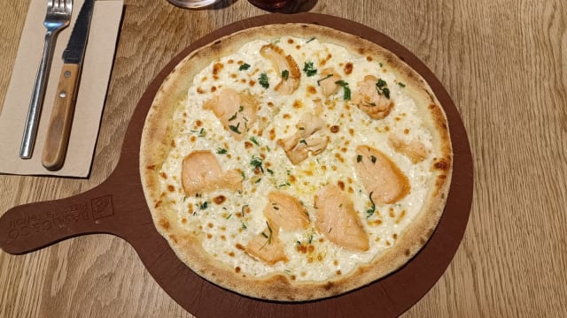 Mozzarella fior di latte, champignons bruns de paris, poulet rôti maison et ciboulette fraîche.
