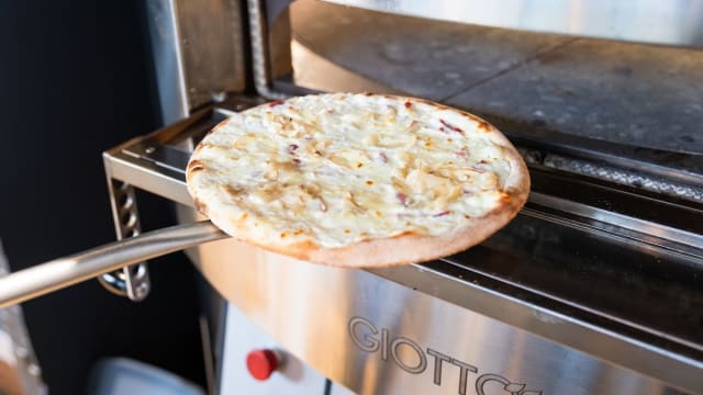 Crème, mozzarella fior di latte, champignons bruns de paris, poitrine paysanne fumée au bois de hêtre, tome des bauges AOP et ciboulette fraîche.