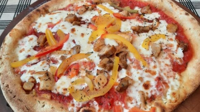 Mozzarella fior di latte, champignons bruns de paris, poulet rôti maison et ciboulette fraîche.
