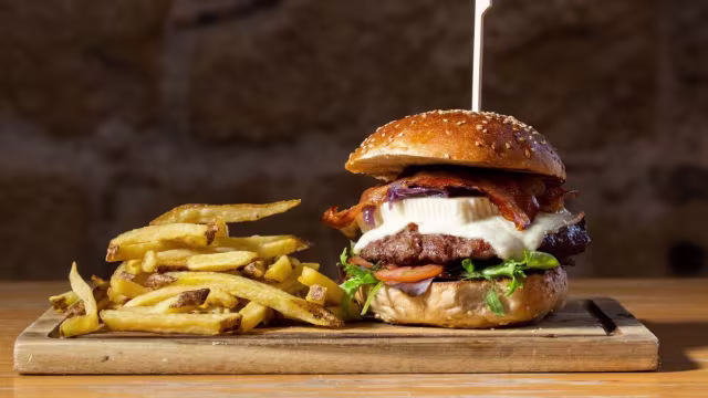 - Panino soffice con impasto di farine siciliane, hamburgher di scottona siciliana (160 gr.), misticanza, pomodoro, bacon, cipolla rossa caramellata, primosale, bbq della casa e patatine fritte