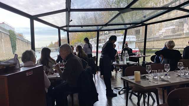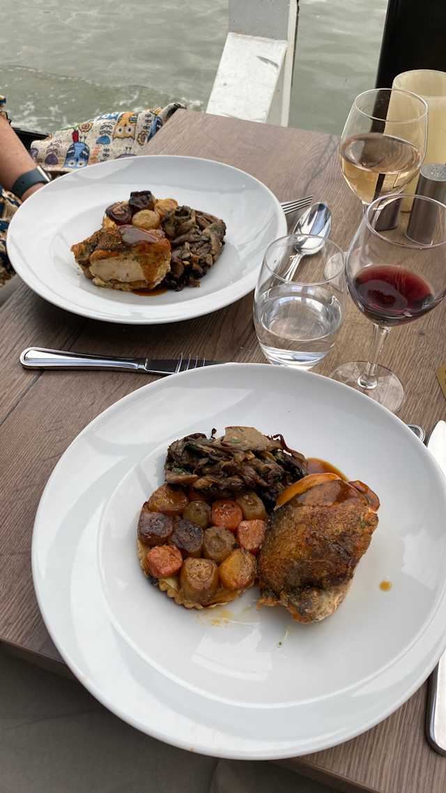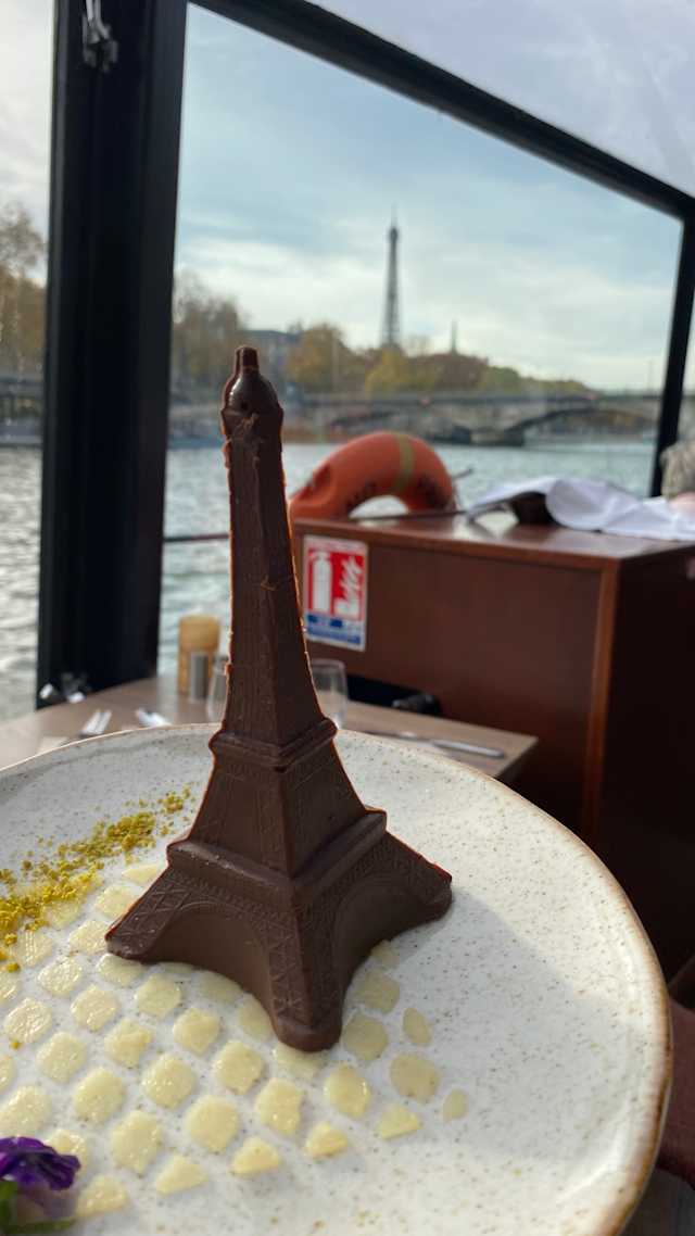 9/10This was seriously the first thing we did when we arrived in Paris!! Checked in at our hotel at 5, freshened up in 10 min and got into the taxi and made it by 6:10! Got greeted and seated. We ordered drinks and then we ordered dinner… I, the chicken which came with zucchini in some sort of heavenly eggy custardy concoction, tomato and eggplant. Yum. And my husband, the beef. The starter was a cross between a caprese salad and bruschetta. It was absolutely delicious and beautifully plated. My dinner, as I said, was wonderful, but my husband didn’t particularly care for the beef. It cost 9 euro more jfyi, but I think he’s used to the beef from the states which has more marbling and maybe more flavor. It came with a potato soufflé and sweet potato The chocolate mousse enveloped in dark chocolate was melt in your mouth lovely And the key lime pie thingy was just fantastic! We ordered wine and 2 beers and some water and so our bill after paying ahead was an extra $42. Of course, the entire reason was to enjoy the cruise and that we did!! It was awesome! And I had forgotten about the entertainment, which , I’m not sure if it’s always the same one, but tonight we were treated to a young lady with a gorgeous voice singing some jazzy tunes past and present. Couldn’t have expected a more lovely time!