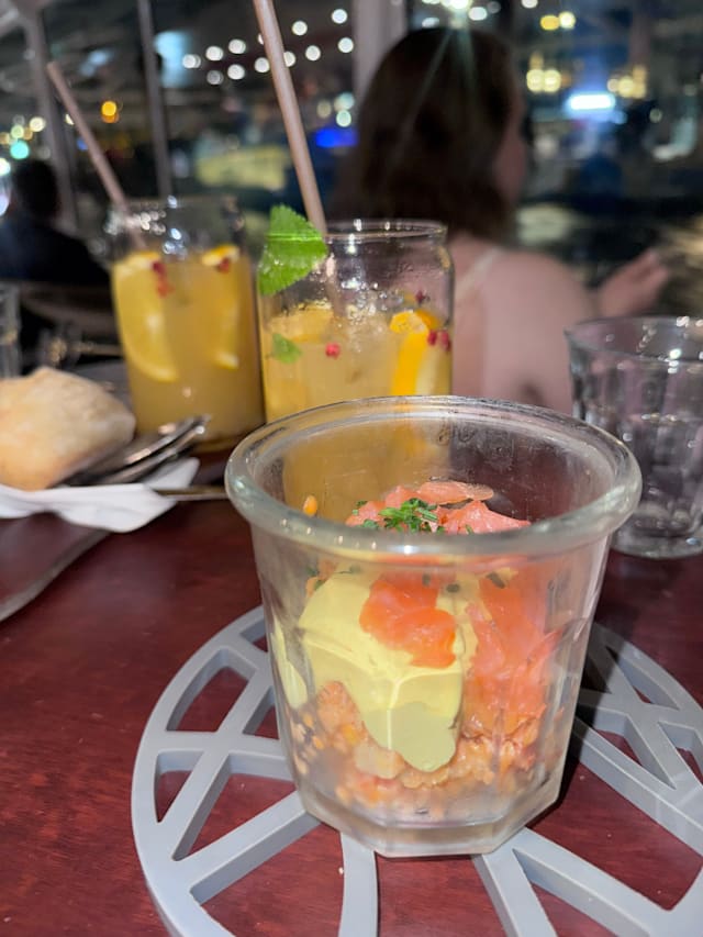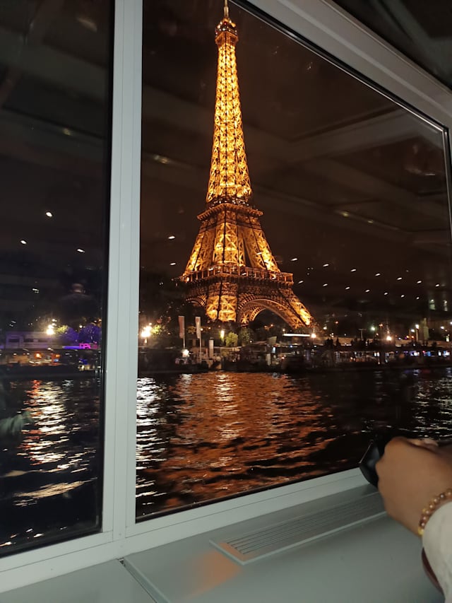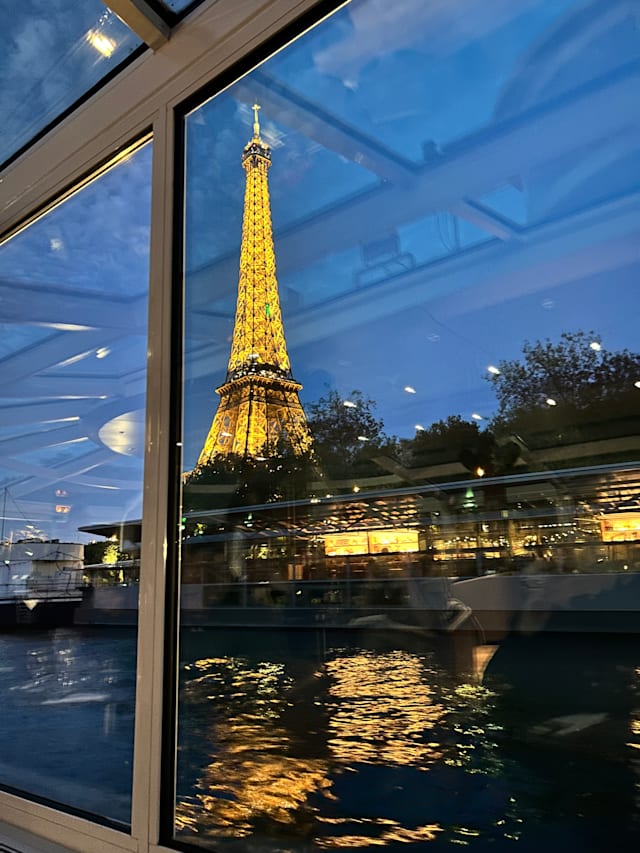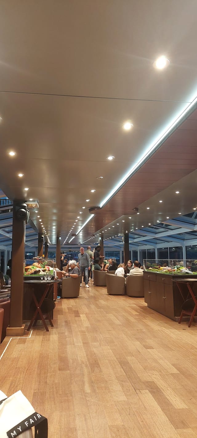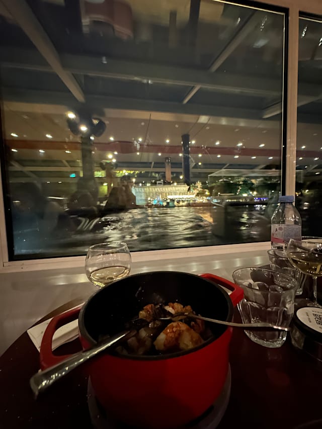6/10Departure time 7.15pm not 7,pm as it says in the ticket. Positives this is a lovely boat with comfortable seats and a great view over the Seine as you travel. Just be aware it leaves from the Iles de Cygne so it is a distance away from the main quay under the Eiffel tower. Neutral for the food starter is a cheese pastry, main course is meat or fish stew and dessert is rice with milk or chocolate mousse.. The food was ok but nothing special. Negatives as we boarded we had a problem with the ticket we produced from the fork but that was resolved, It took an hour to be served drinks - the cruise is 1h45 mins - and when they were arrived they were wrong but were changed quickly. I ordered fish stew and my husband meat stew. Several people around us were served the incorrect dish and we didn't get any food for ages. Eventually my husband was given his meat stew. I had to find someone to try to get my fish but was told there wasn't any left so had meat instead. Other people were served bread rolls and we weren't. When we received our drinks bill our waitress didn't understand we had already paid for one of our half bottles of wine. This was resolved by one of her colleagues. We still hadn't been served our dessert as we were due to dock. My husband went to ask for it and then it arrived but we were told it was up to us to ask for things if we hadn't been served. Conclusions serious staff training and streamlining us needed as the food and drink standard and service were not what we expected. This lets down what should be a lovely experience on this beautiful boat.