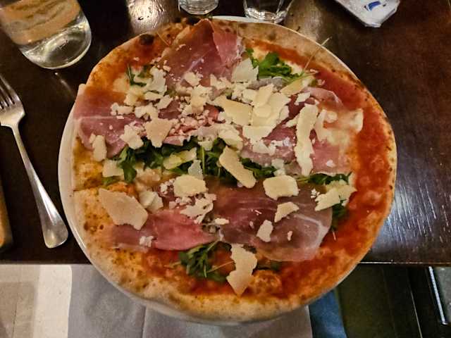 - Tomates san marzano DOP, mozzarella fior di latte, origan champignons de paris, jambon cuit gran biscotto