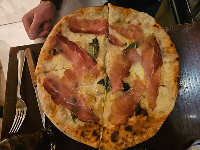 - Mozzarella fior di latte, guanciale (lard), peccorino DOP, jaune d’œuf, poivre, basilic