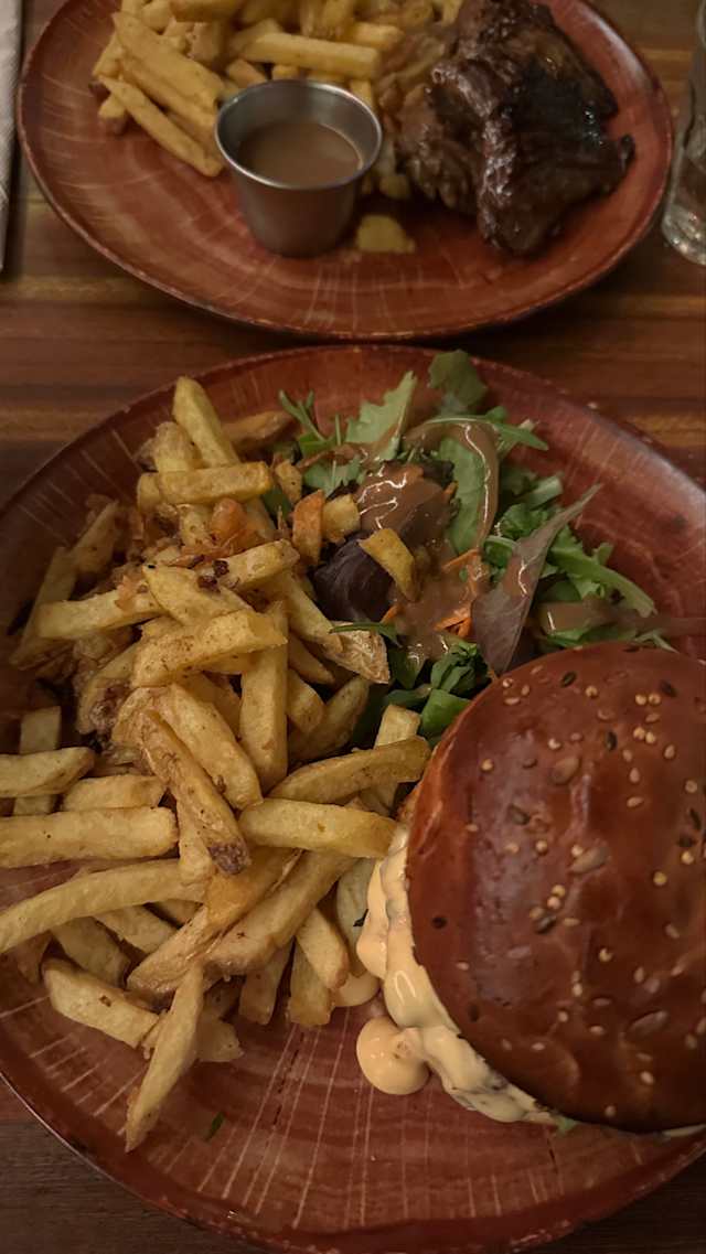 - Viande angus, servi avec une sauce au poivre, frites maison & salade