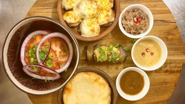 3 khinkali with champignon, brown bean stew, grilled aubergine, spinach and salad with walnut paste and corn bread
