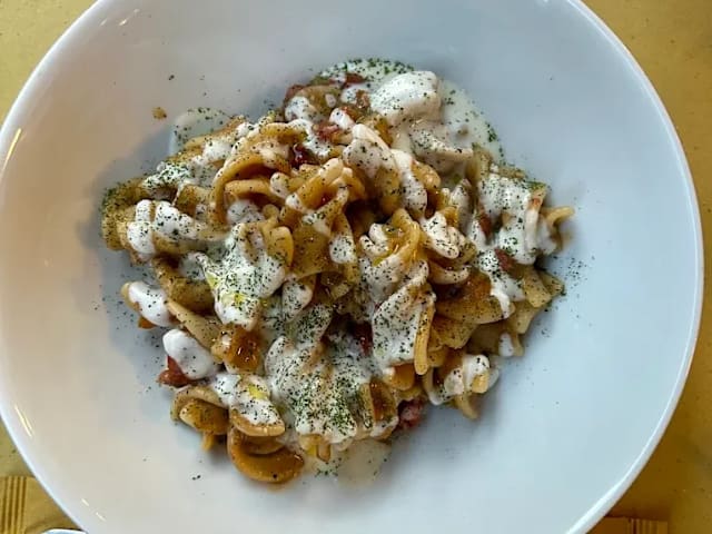Spaghetti mantecati al caciocavallo, guanciale croccante e zucchine fritta