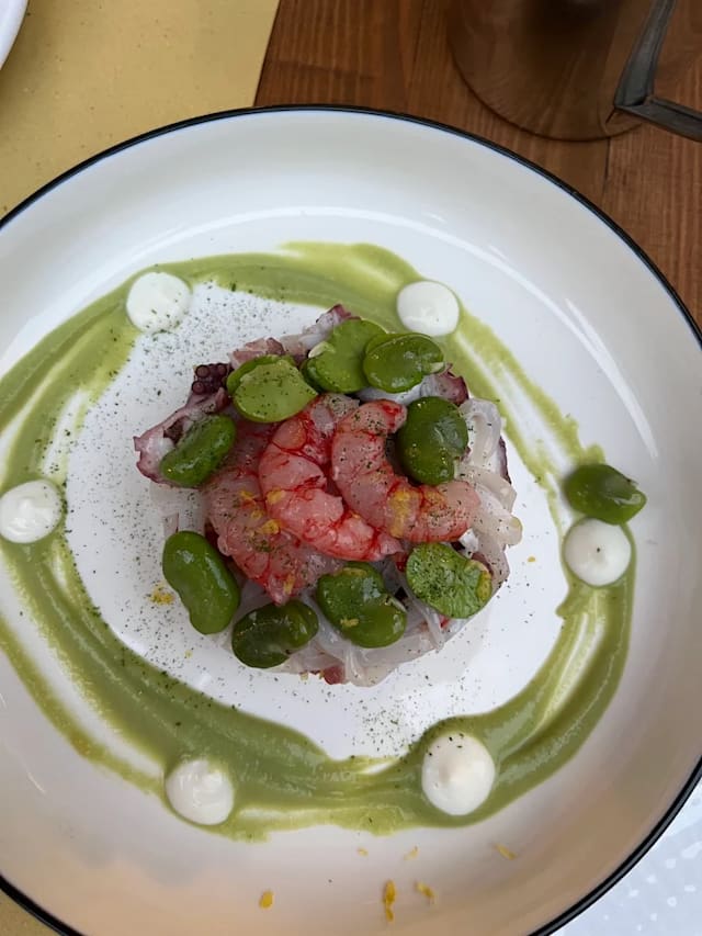 Insalata di mare con polpo, calamaro, gambero rosa, variazione di limone
