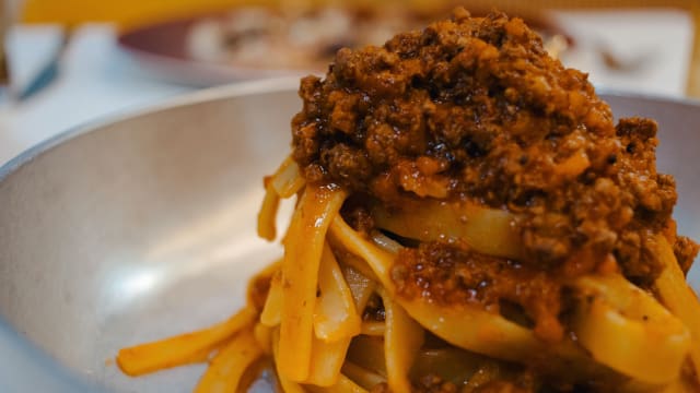 Spaghettoni alla chitarra di pasta fresca "UE Bauscia" al sugo di carne e pomodoro con polpettine di manzo a cottura lenta