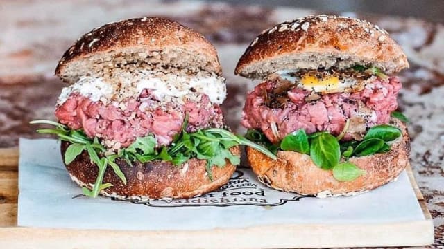 Hamburger di chianina e cinta senese, uovo a occhio di bue, formaggio chetar, bacon, pomodoro, lattuga, cipolla fritta, salsa BBQ