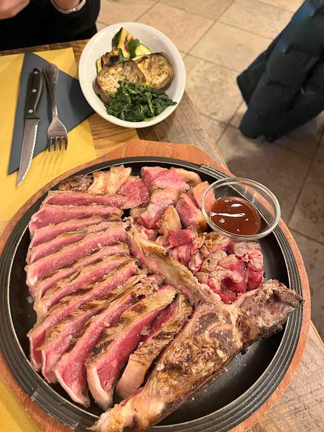 - Fiorentina di chianina alla brace servita con mix di verdure e salse