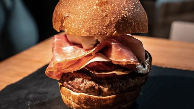 Hamburger di angus (cottura al sangue) 250gr. crudo di norcia, melanzana fritta, pomodori secchi, burrata, con patatine fritte*.