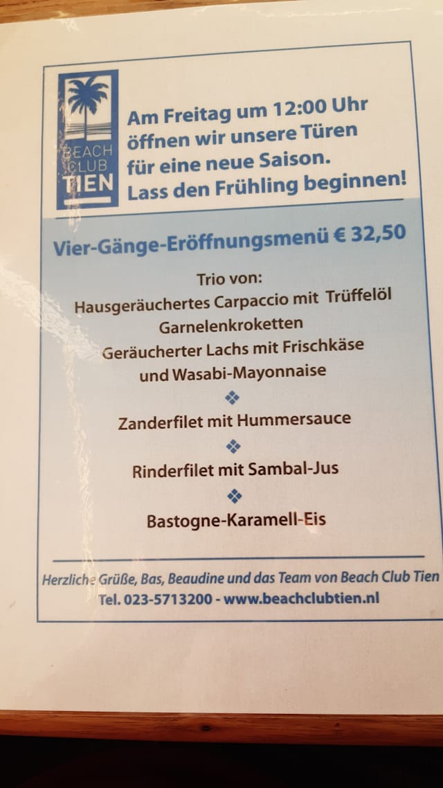 10/10My daughter and I had many options when we went to the Zandvoort beach looking for dinner. Beach club Tien had a nice menu and view. We were so very happy with our evening. First having drinks in comfortable chairs overlooking the ocean and then eventually sitting down for dinner. Everything was perfect. The servers , especially Dak and Jason were kind and professional. This always makes a big impression, especially on a Monday when I am sure they are recovering from their busy weekend serving many people! My daughter and I had the Tournedos which was perfectly cooked . The desserts were very generous, beautifully presented and delicious! We will definitely be back.