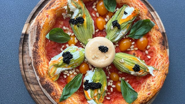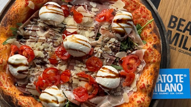 Impasto classico, base focaccia rossa, pomodorini, bocconcini di bufala campana D.O.P., rucola, crudo di Parma, scaglie di grana padano, glassa di Modena
