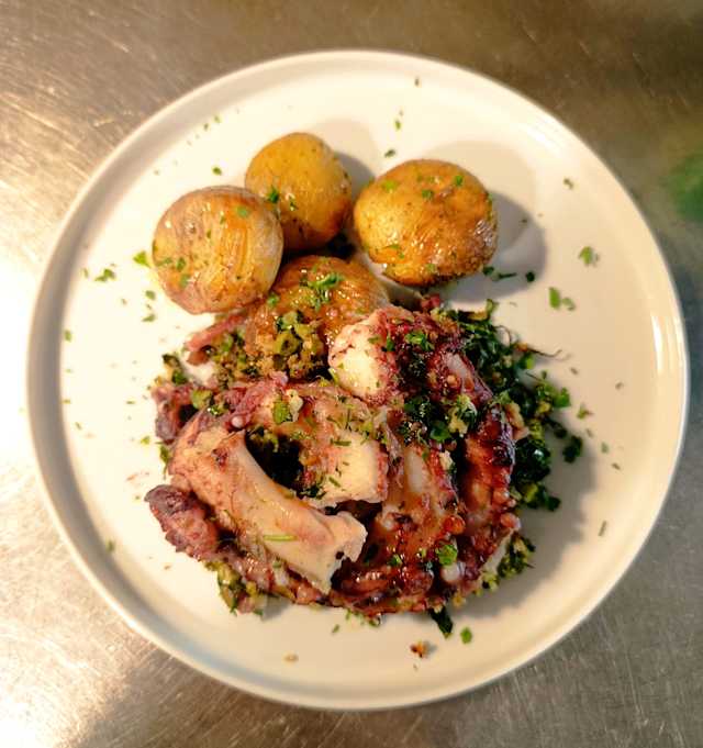 - Polvo á lagareiro com batata e migas de caldo verde com bacon e broa