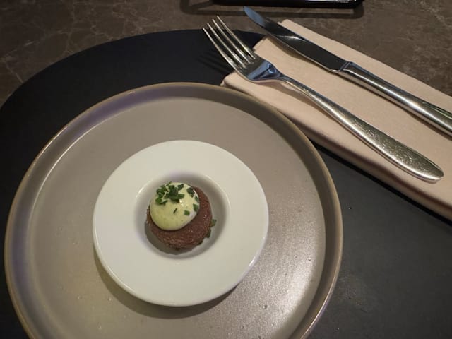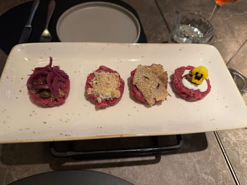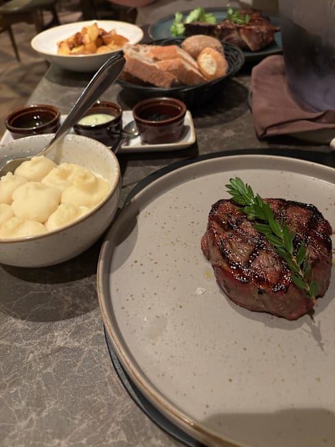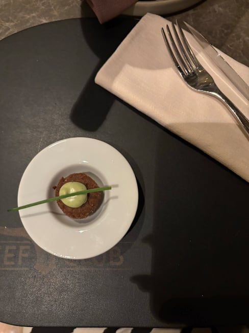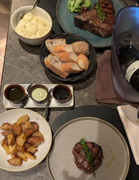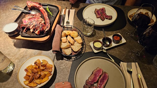 6.5/10+1I feel that I have a poor grasp of steak doneness. We ordered both steaks to be medium. The first steak came in two pieces; one was completely overcooked and tough, while the other was just right at medium. The second steak was also a bit more done than medium, leaning towards medium well, which was not particularly satisfactory. The aperitif was acceptable; the anchovies were good, but I was disappointed with the steaks; the beef tartare was okay, just average.