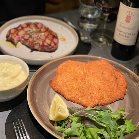 8.5/10Well decorated restaurant close to the Santa Maria delle Grazie church. Service was a bit speedy as my plate was taken away while I was still chewing. Meats were very well seasoned and cooked, but we were a bit disappointed by the fact that side dishes were not included with the meat: 30euros just for one piece of meat is too expensive, even if the meat is high quality. We thus ordered spinach and puree as extra dishes, quantities were huge but tasted quite bland, taste could be improved. Desserts were tasty and large.