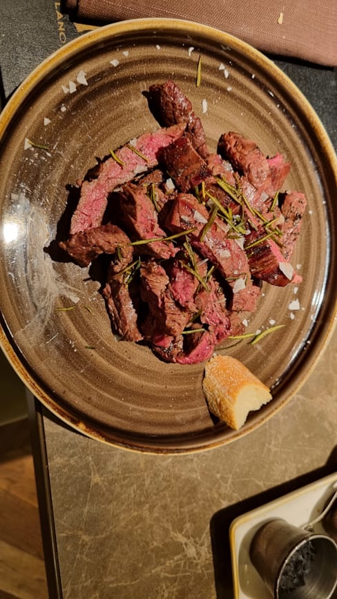 6.5/10+1I feel that I have a poor grasp of steak doneness. We ordered both steaks to be medium. The first steak came in two pieces; one was completely overcooked and tough, while the other was just right at medium. The second steak was also a bit more done than medium, leaning towards medium well, which was not particularly satisfactory. The aperitif was acceptable; the anchovies were good, but I was disappointed with the steaks; the beef tartare was okay, just average.
