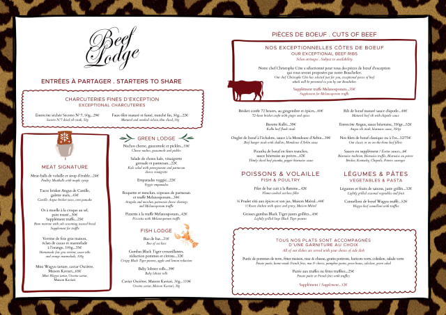 Été comme hiver, dans une atmosphère chic et glamour, le Lodge Park vous propose un voyage de saveurs à travers la cuisine raffinée du Beef Lodge, un steak house proposant une sélection de viandes en provenance des meilleurs élevages. On savoure sans modération des viandes ultra fondantes ou confite...