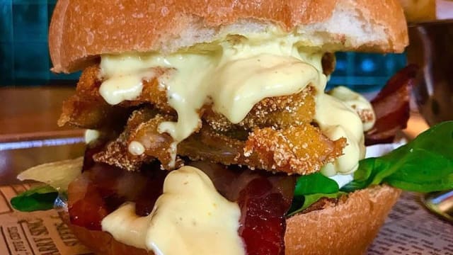 - Pane multi-cereali, hamburger vegetariano, cheddar, hummus di ceci, guacamole, spinacino e maionese al basilico