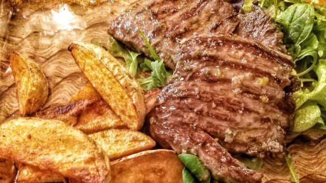 - 250g di tagliata di roast beef irlandese con rucola fresca, scaglie di grana e pomodori semi-secchi. Servito con patate a spicchi speziate