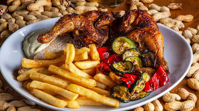 Costine di maiale con contorno di patate fritte*, accompagnate da salsa befed