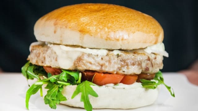 Pane bianco al latte con sesamo*, hamburger di manzo* da 155 gr, insalata, pomodoro, cipolla e salsa della casa
