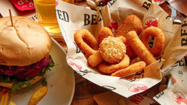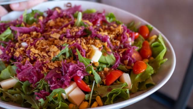 Insalata misticanza, pulled chicken, scaglie di grana padano, cipolla crispy. Guarnita con salsa befed
