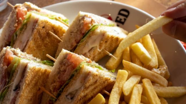 Pane bianco in cassetta, galletto befed, salsa befed, prosciutto di praga, formaggio edamer, melanzane, maionese, insalata, pomodoro a fette. Accompagnato da salsa rosa