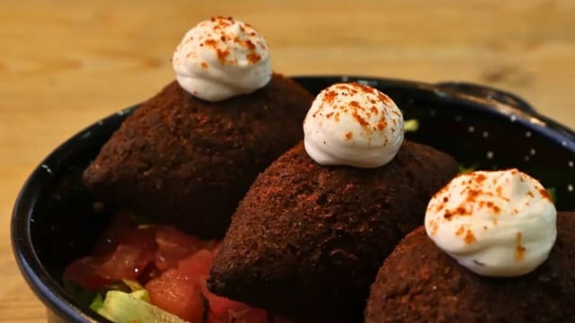 Croquetas vegetales con base de garbanzos y tahini, servidas con salsa tarator, lechuga, tomate y menta