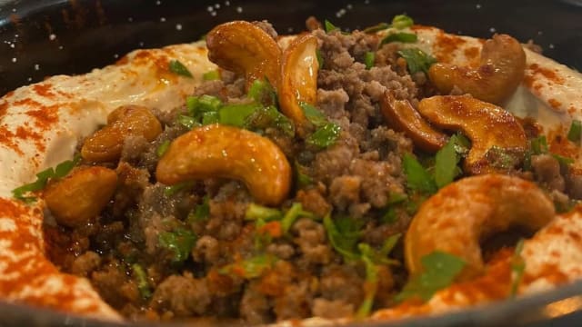 Hoummus o la crema que quieras con carne de ternera salteada servida con anacardos
