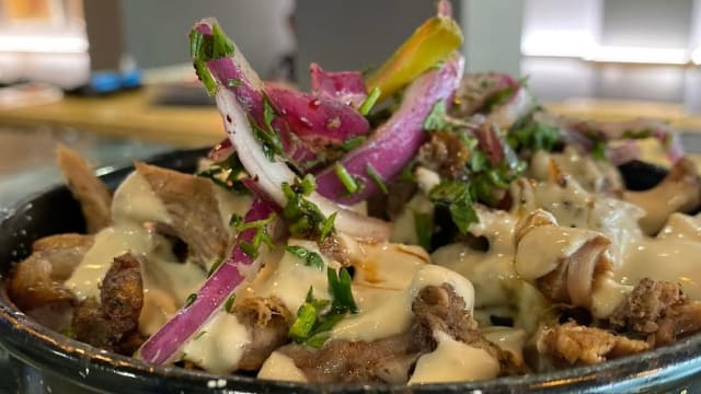 Tiras de carne de secreto ibérico adobadas con especias de shawarma y salsa tarator. Puedes escoger para acompañar, tomate y cebolla al horno, patatas o arroz