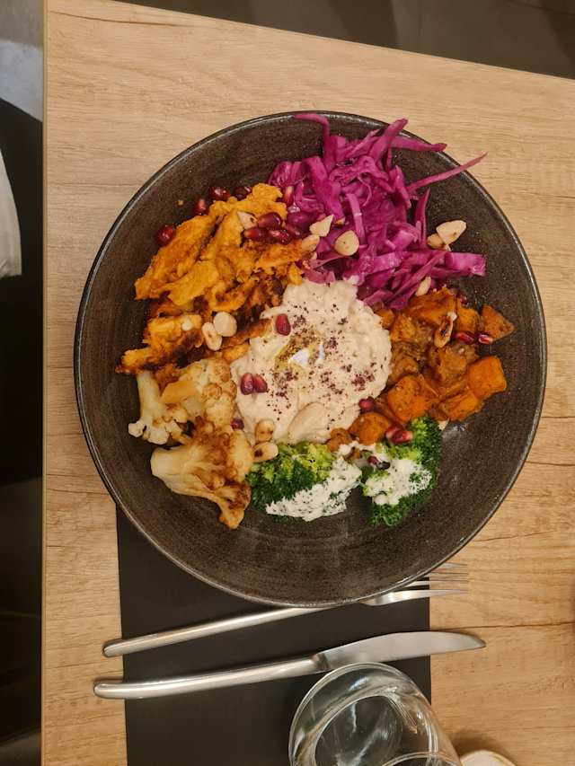 - Basturma, chou rouge mariné, patate douce au paprika, chou-fleur frit, caviar d’aubergine, brocoli à la sauce tahini, amandes grillées