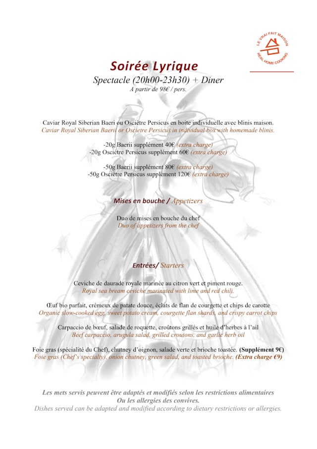 9/10What a special experience! A lovely setting with classic and tasteful china and crystal tableware. The Menu is limited, and it's probably a good idea to read it before arriving. (The French is printed in black, the English in faded red, making it quite a challenge to read). There are 5 extremely talented and personable operatic singers who entertain you while you're enjoying your dinner. While dessert is being served, all of the diners are encouraged to "sing along" to a familiar number. All in all, a memorable and satisfying experience!