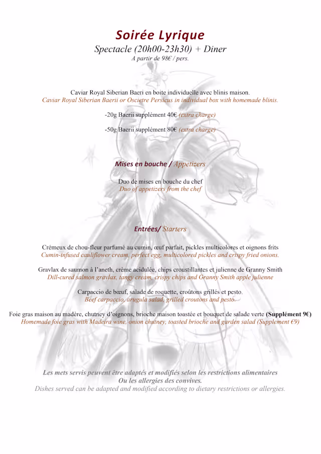 What a special experience! A lovely setting with classic and tasteful china and crystal tableware. The Menu is limited, and it's probably a good idea to read it before arriving. (The French is printed in black, the English in faded red, making it quite a challenge to read). There are 5 extremely talented and personable operatic singers who entertain you while you're enjoying your dinner. While dessert is being served, all of the diners are encouraged to "sing along" to a familiar number. All in all, a memorable and satisfying experience!
