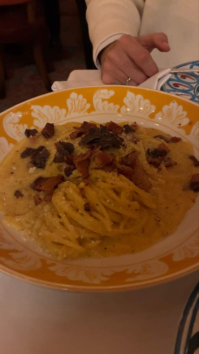 - Porción para una persona de spaghetti caseros con auténtico guanciale de la toscana (carne de cerdo), queso pecorino y huevo, servido directamente en el plato