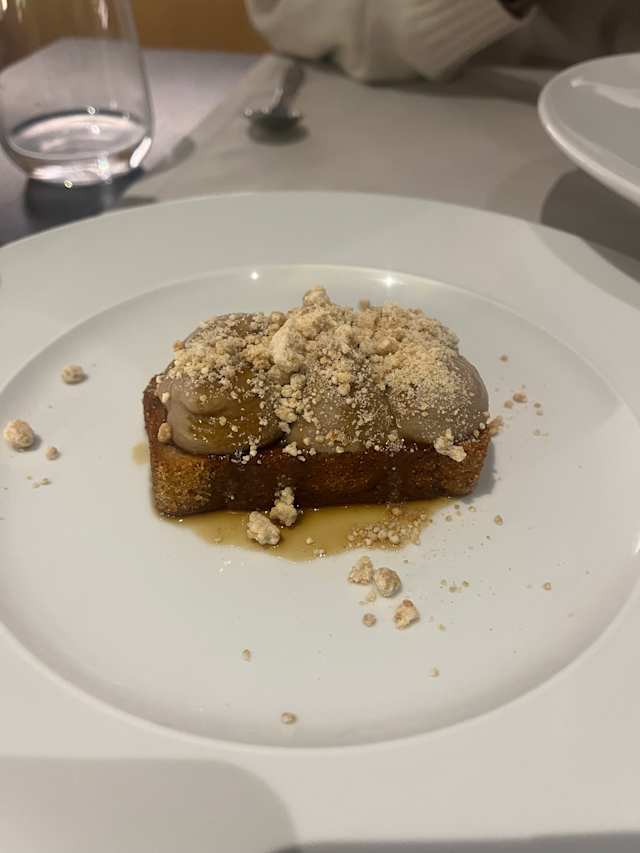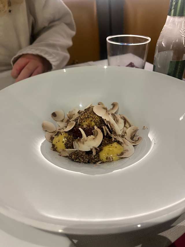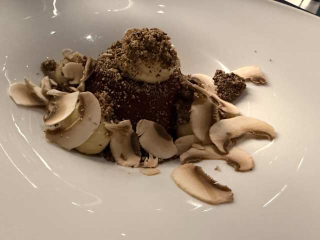 - Beetroot and amaretti cake with black truffle custard, buckwheat crumble, and champignon shavings