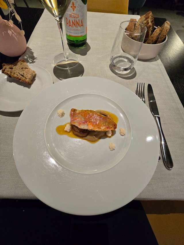 - Seared red mullet with chestnut cream, roasted leeks, mountain pine oil and horseradish