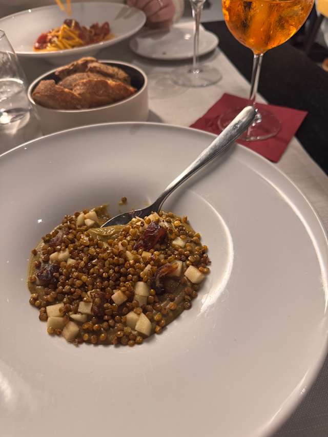 - Spiced lentil cream with saffron and cardamom, green apples, dates, and fried lentils